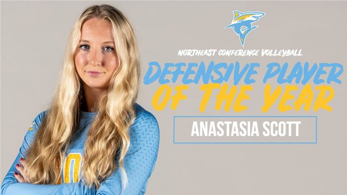 Senior Anastasia Scott was named the Northeast Conference Defensive Player of the Year in volleyball for the second consecutive year. She led the conference by a wide margin with 5.38 digs per set, finishing ninth in the nation in the category. Scott was also named first-team All-NEC alongside senior Jovana Stekovic, while junior Karolina Nova earned second-team All-NEC honors.